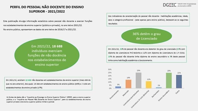 Indicam as estatísticas da DGEEC, de 2021/2022, que existem cerca de 18.688 funcionários em Portugal, dos quais 15.484 (83%) desempenham funções nas instituições de ensino superior (IES) públicas.