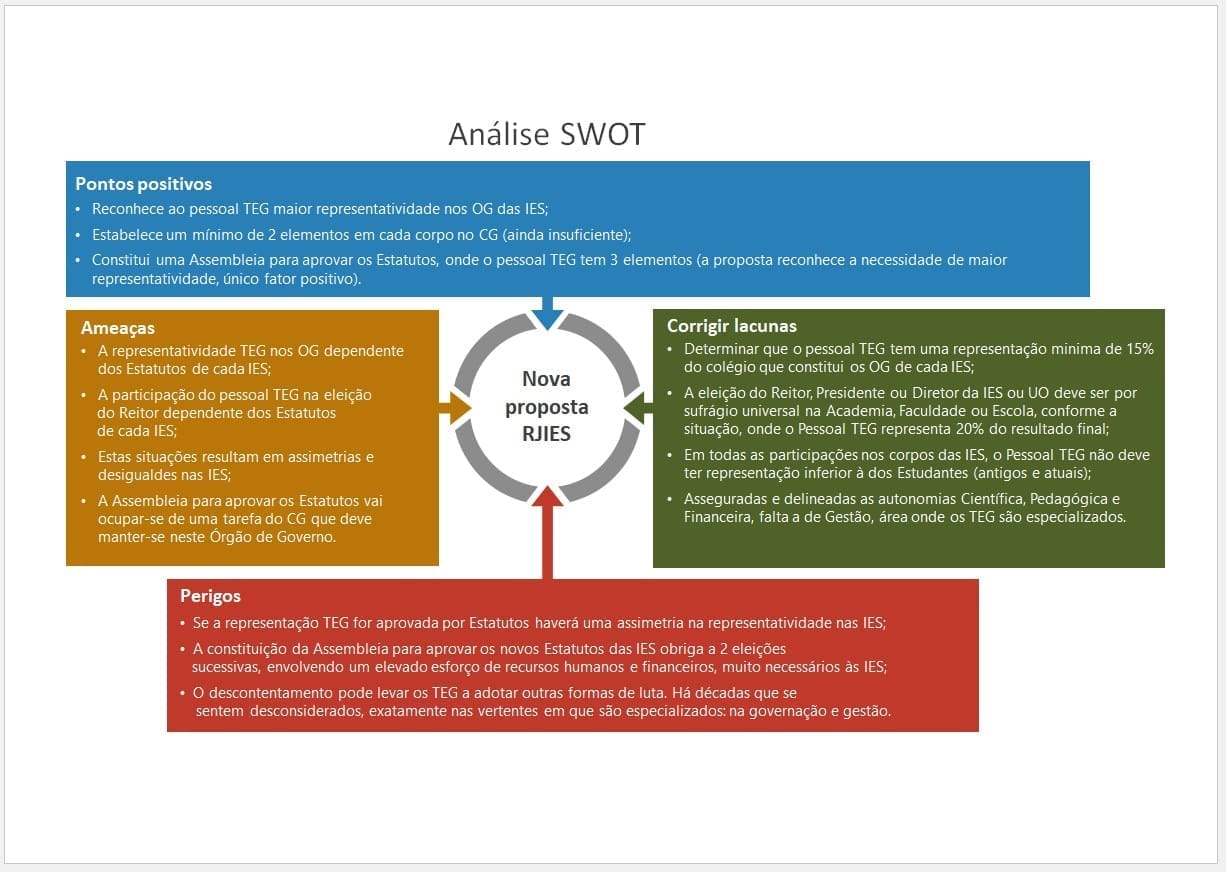 Roberto Sousa apresentou uma análise detalhada, incluindo uma análise SWOT que identifica oportunidades como o reconhecimento dos cerca de 16.000 profissionais TEG – muitos com qualificações superiores (41% técnicos superiores, entre os quais, 17% já com mestrado ou doutoramento) – e ameaças como assimetrias entre instituições, caso a representatividade continue a ser deixada para os estatutos das instituições.