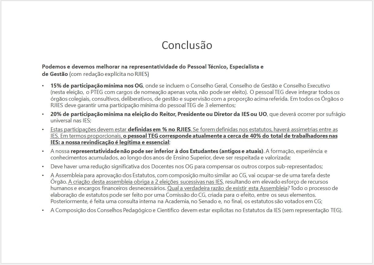 — Referiram que, atendendo à percentagem que hoje representa o pessoal TEG nas IES (41%), consideram que é muito pertinente e de elementar justiça que tenham uma maior representação nos órgãos.