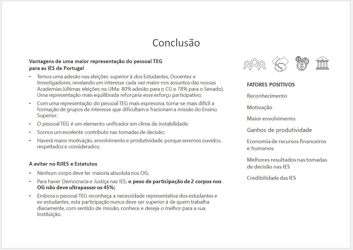 — Informaram que vão avançar com uma Proposta, defendendo uma maior participação dos TEG nos órgãos de gestão.